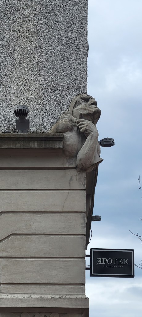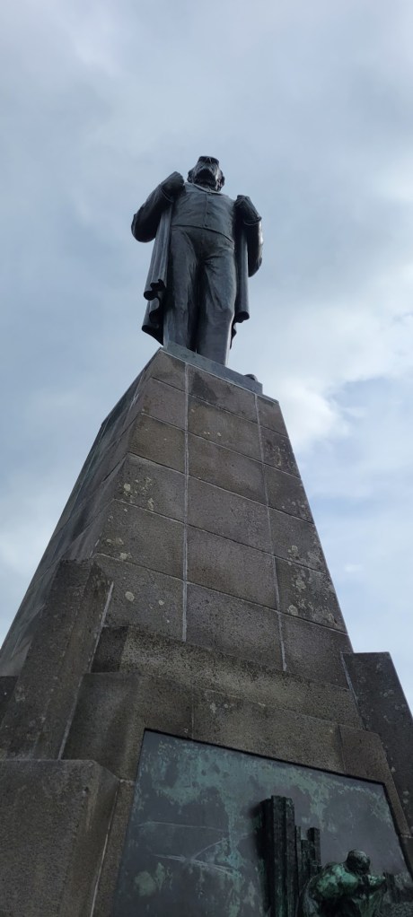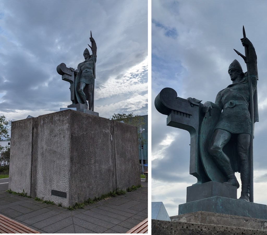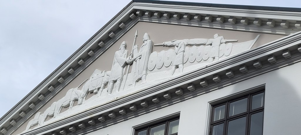 We had some time to kill before the museums opened at 10:00 a.m. so we started walking, stopping at Arnarhóll Park. The photo at the top of this post shows the view north from the hill that forms most of the park and which features a statue of Ingólfur Arnarson. The statue was created in 1907 by Einar Jónsson (more on him in a later post) and erected here in 1924. Arnarson is considered the founder of Reykjavík. Legend has it that when he left Norway and spotted Iceland’s shore in 874, he tossed his stone seat pillars overboard, stating wherever they washed ashore, that is where he would build his new home. Those pillars are on display elsewhere in Reykjavík. The park was pretty but would have benefited from some maintenance.